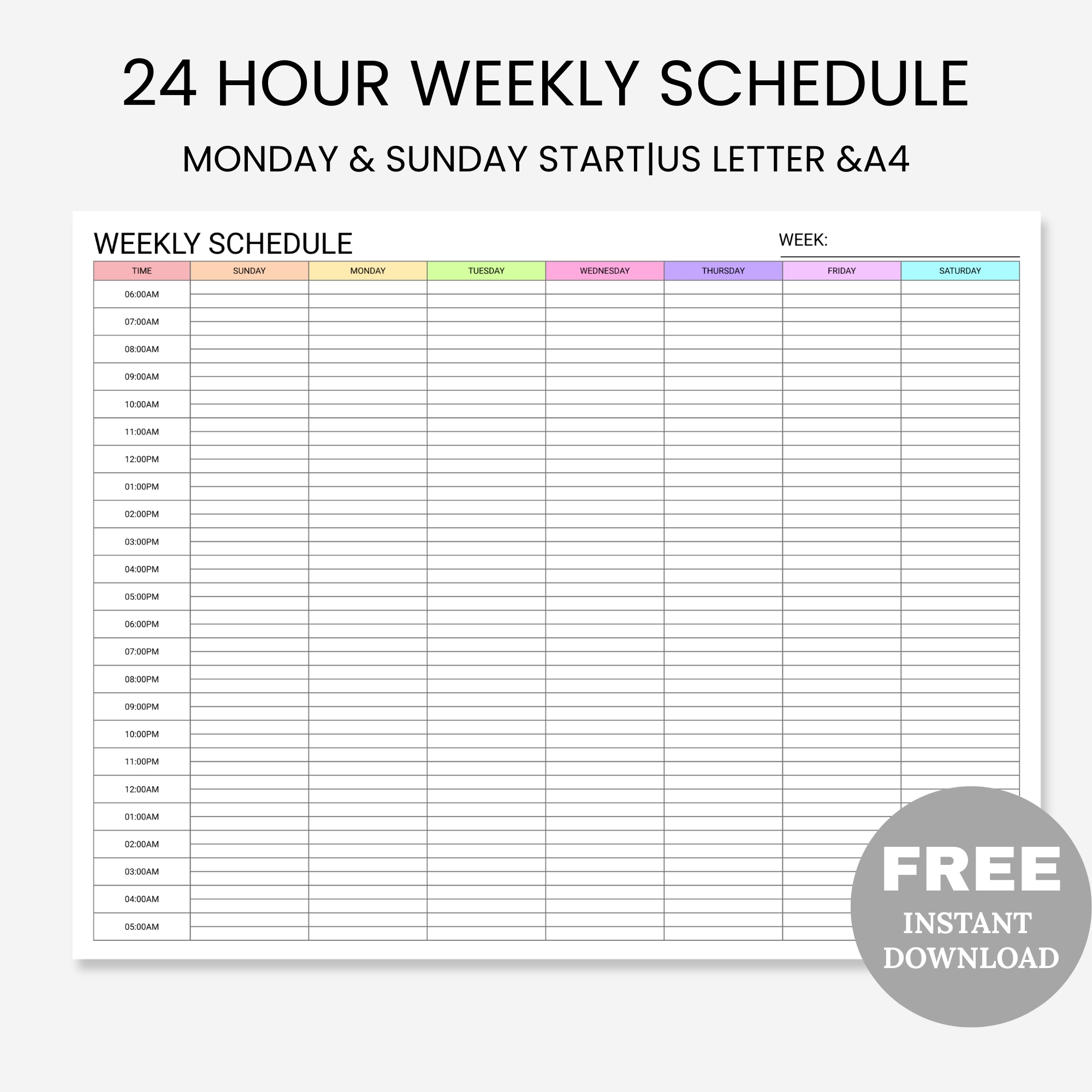 FREE Printable 24 Hour Weekly Schedule Colorful Landscape, 24 Hour Planner, Weekly Half Hourly Plan, Time Blocking, Weekly Time Sheet, Hour by Hour Planner, Weekly Plan
