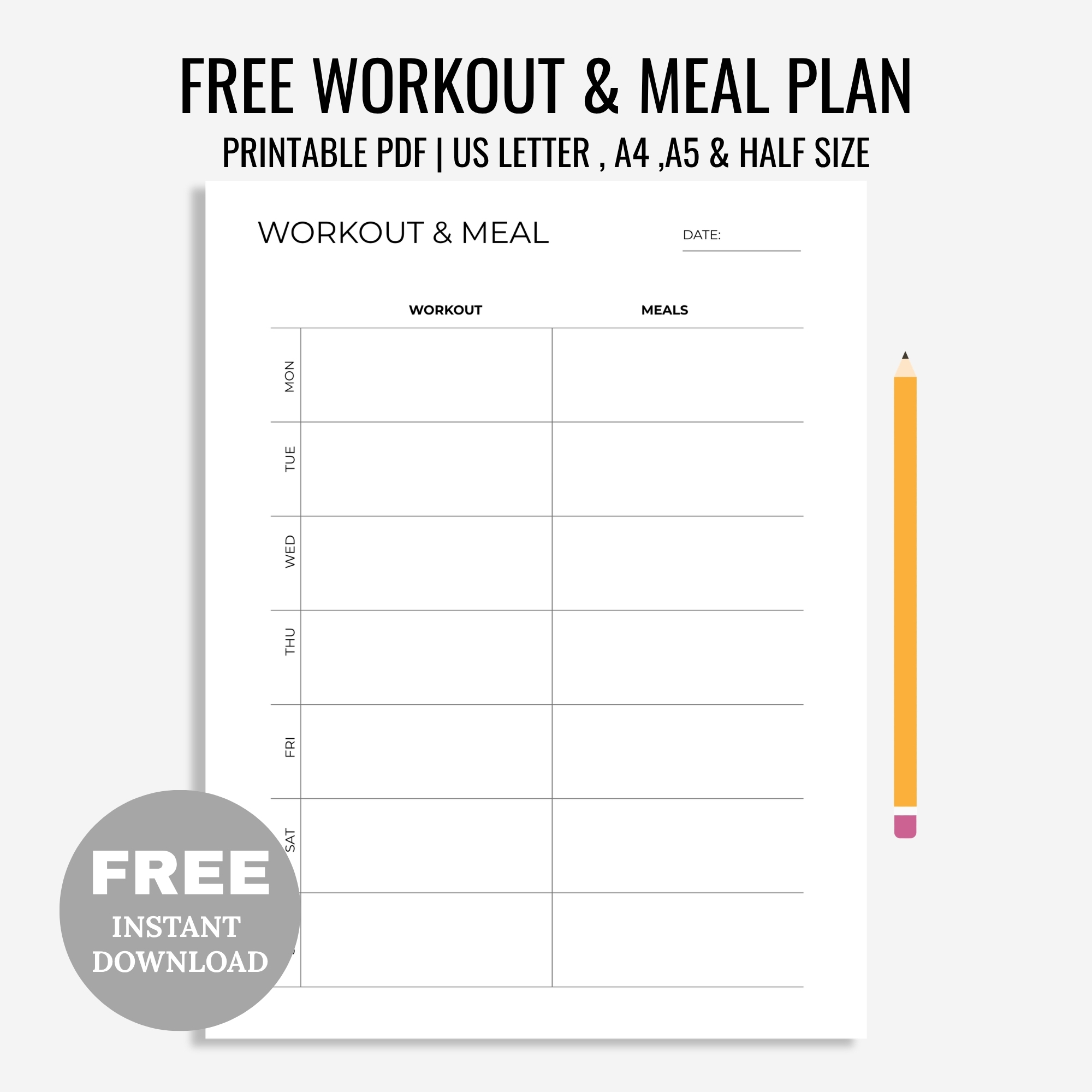 Free Printable Weekly Workout & Meal Planning Printable, Exercise Planner, Menu Planner, Fitness Planner, Health Planner, A4/A5/Letter/Half Size